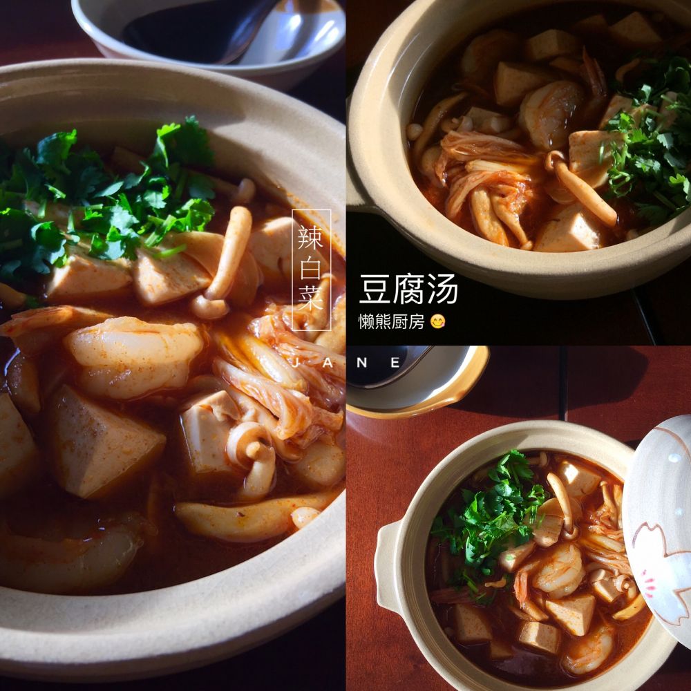 食材:豆腐,辣白菜,蘑菇,虾仁,小青葱或香菜,韩国大酱,韩国辣酱