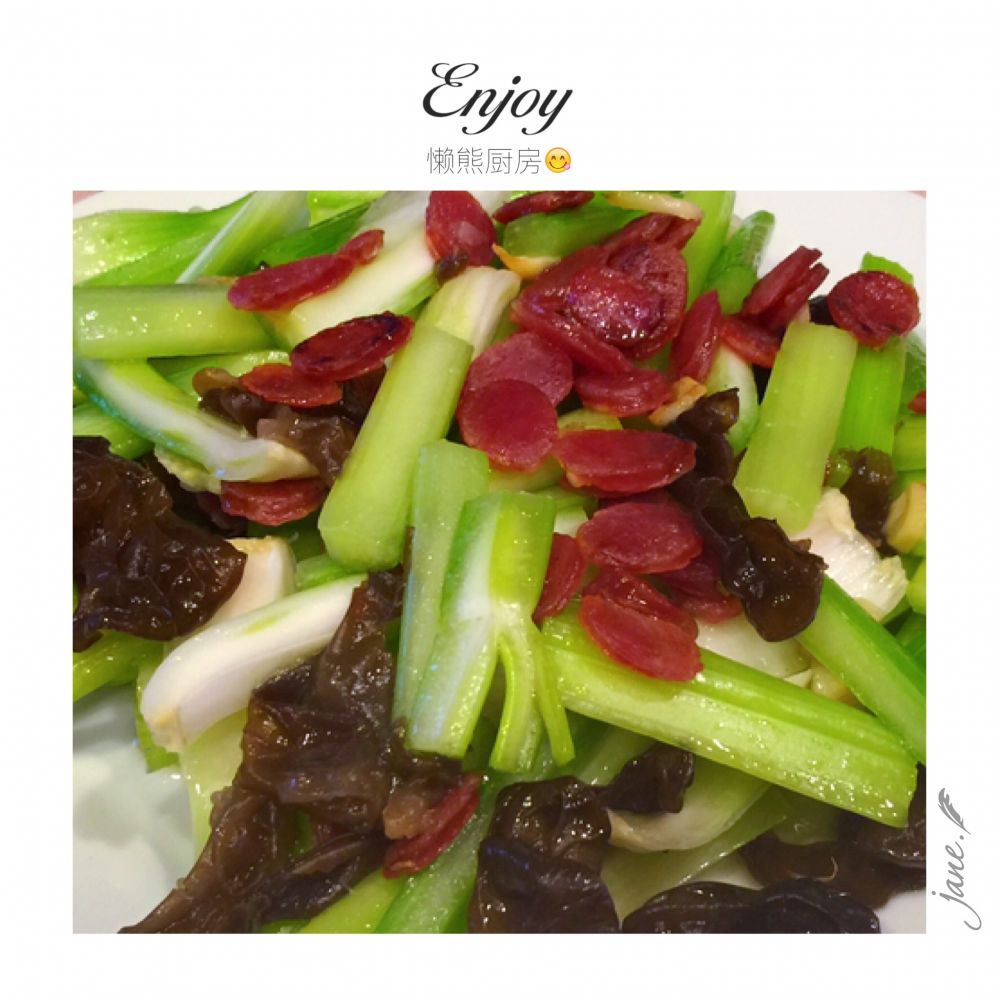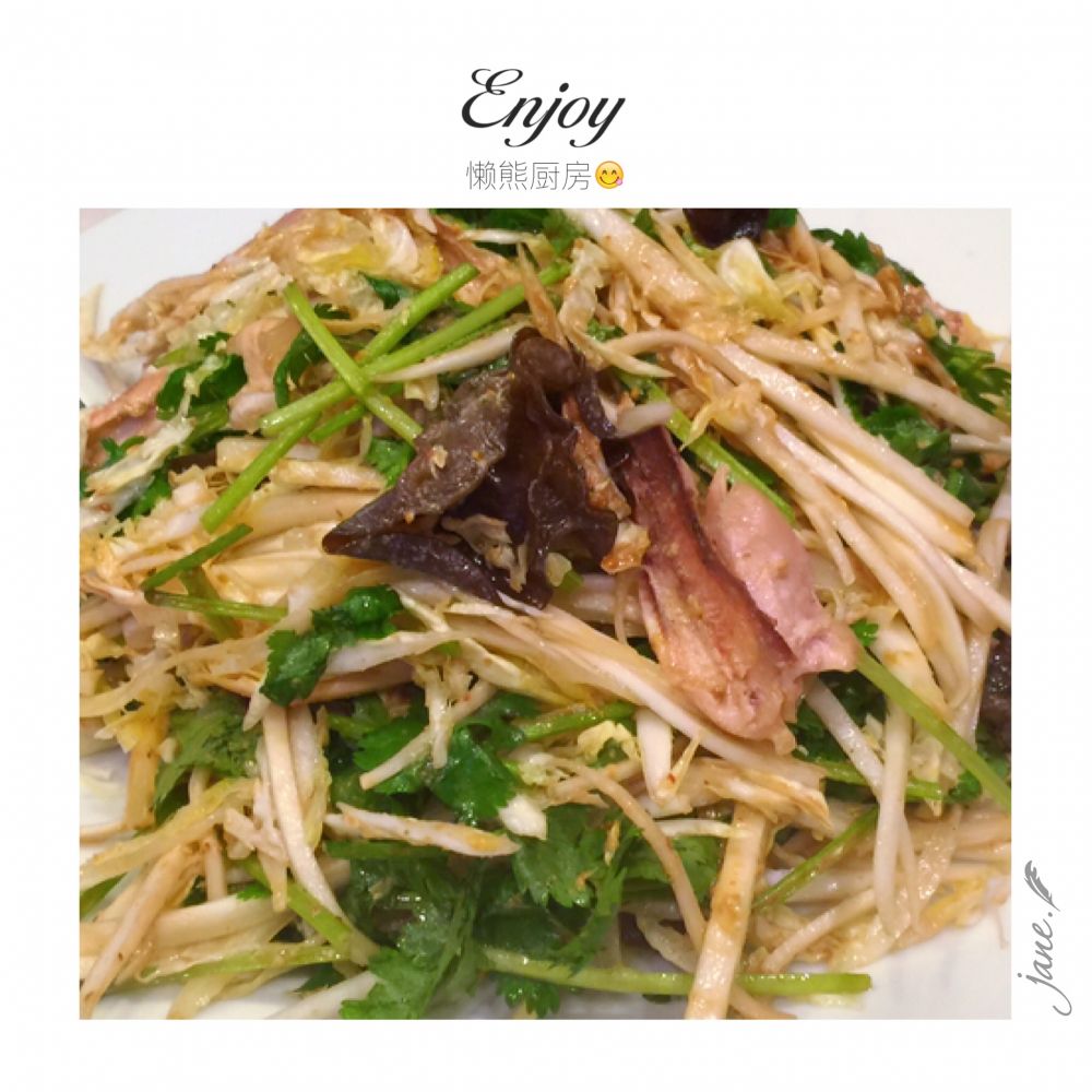 然后加葱姜和发好的木耳。葱和肉的比例大约1:2;姜,木耳适量。
