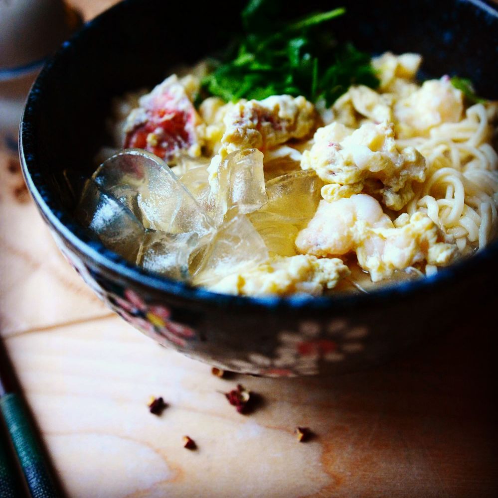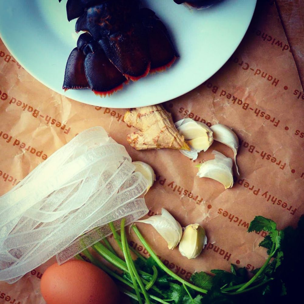 食材:龙虾尾2只,简单两个,姜蒜,香菜,花椒,绿豆粉条或粉皮。干鲜面条