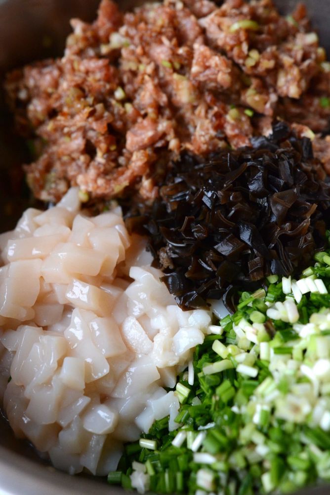 食材:猪肉馅1磅,鲜贝六个,韭菜一把约半磅,木耳适量