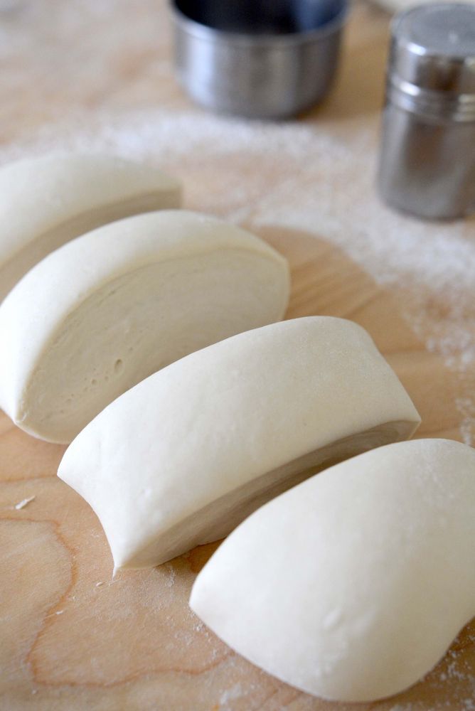 最后醒发好的面团不要揉,放案板一切四。留一块在面板上,其他三块放回面盆加盖以免干燥。