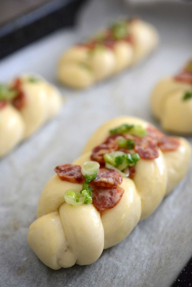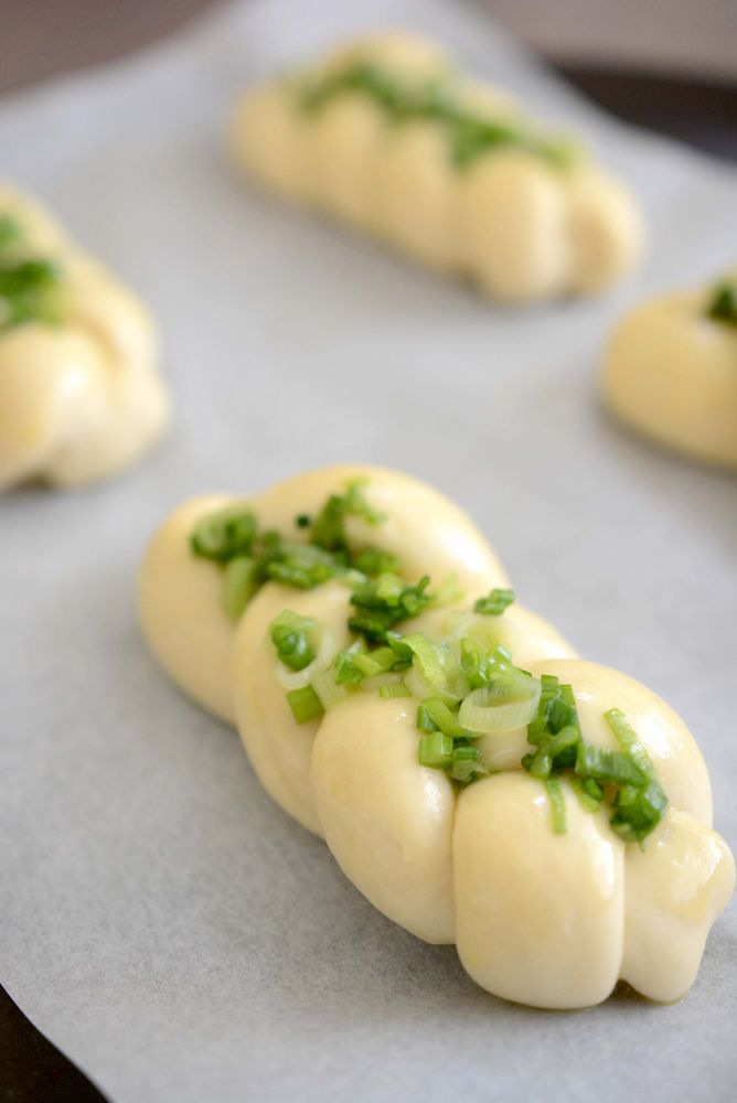 做成辫子面包,二次发酵。刷蛋液,撒葱花,葱花是点睛之笔。葱花用少许盐和橄榄油腌一下。