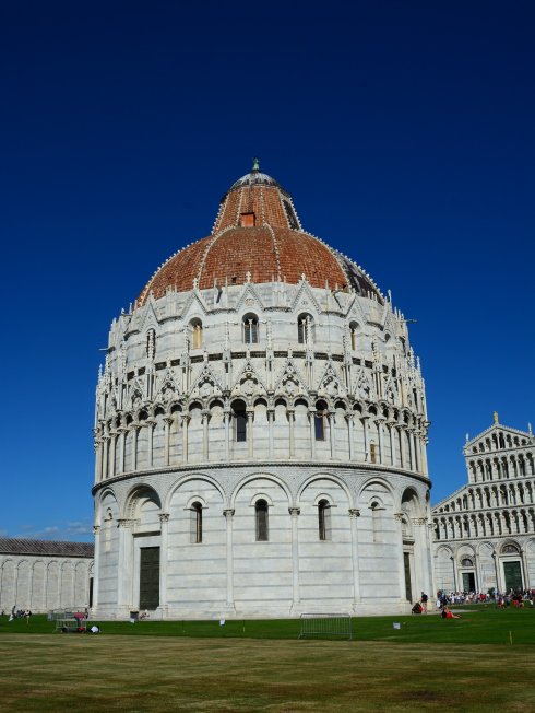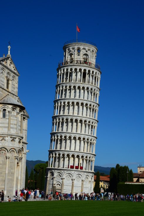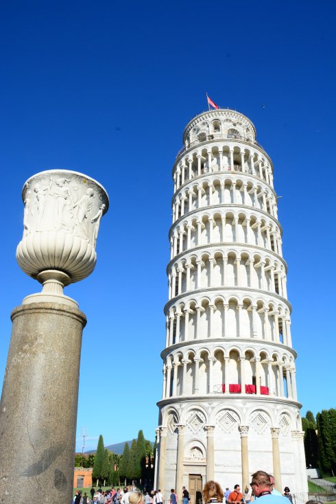 广场最东面是斜塔,它其实是教堂区的一座钟楼,始建于1173年,可是它在开建后不久即开始往东南方向倾斜,最严重的时候甚至比中轴线倾斜了5度之多, 几乎就要倒下了,经过几代人多次抢救性工作,终于稳定在了目前的状态。