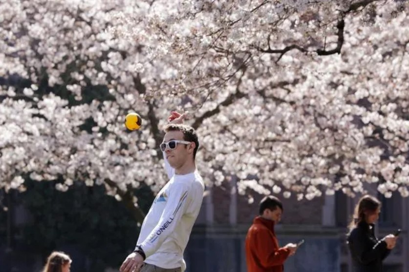 刚刚看到网上这张照片, 据说是美国西亚雅图樱花盛开, 人们在外赏花游乐的情景, 心中不禁充满了羡慕之情!