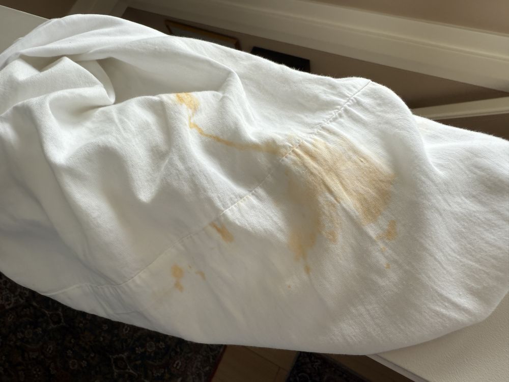 上图是最近刚退房的加拿大某省的韩国年轻男客人留下的枕套污渍。原以为无法漂白,但是经过我耐心实验,终于漂白成功了,因此就没再追他赔偿。