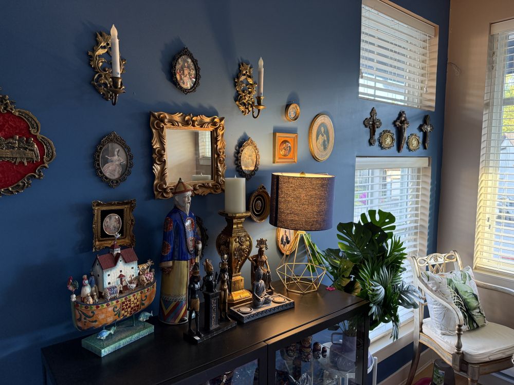 • The room combines classical, ornate details with whimsical objects and symbolic elements, showing a deep appreciation for history, spirituality, and personal storytelling.