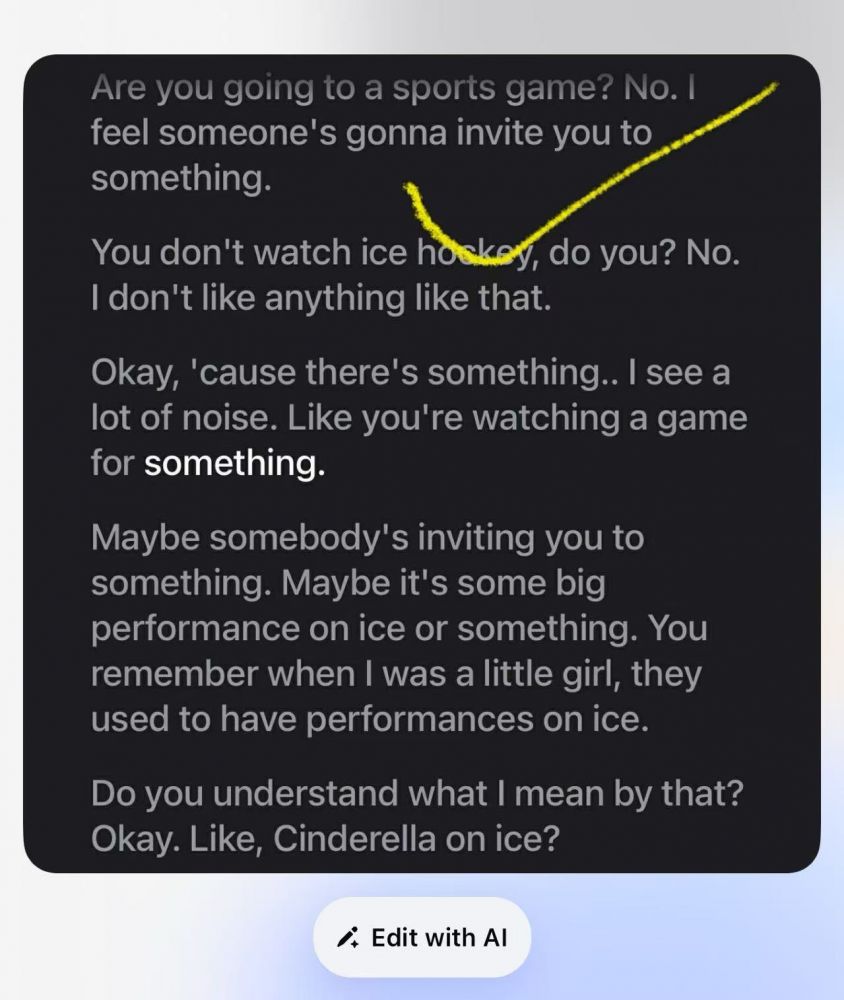 娜塔莉:OK,因为会有什么事儿,我看见很多嘈杂声,像是你在看比赛什么的。可能有人会请你参加什么东西。也许是冰上的大型表演。当我还是孩子的时候,经常有冰上表演。你明白我的意思吗?好比是冰上灰姑娘那类的表演。