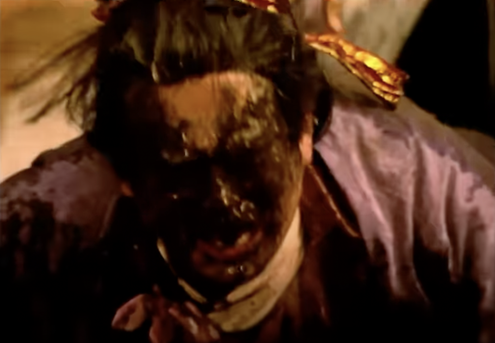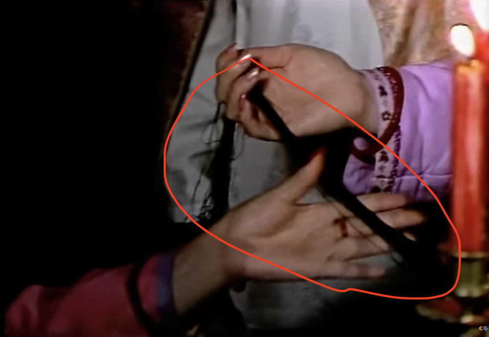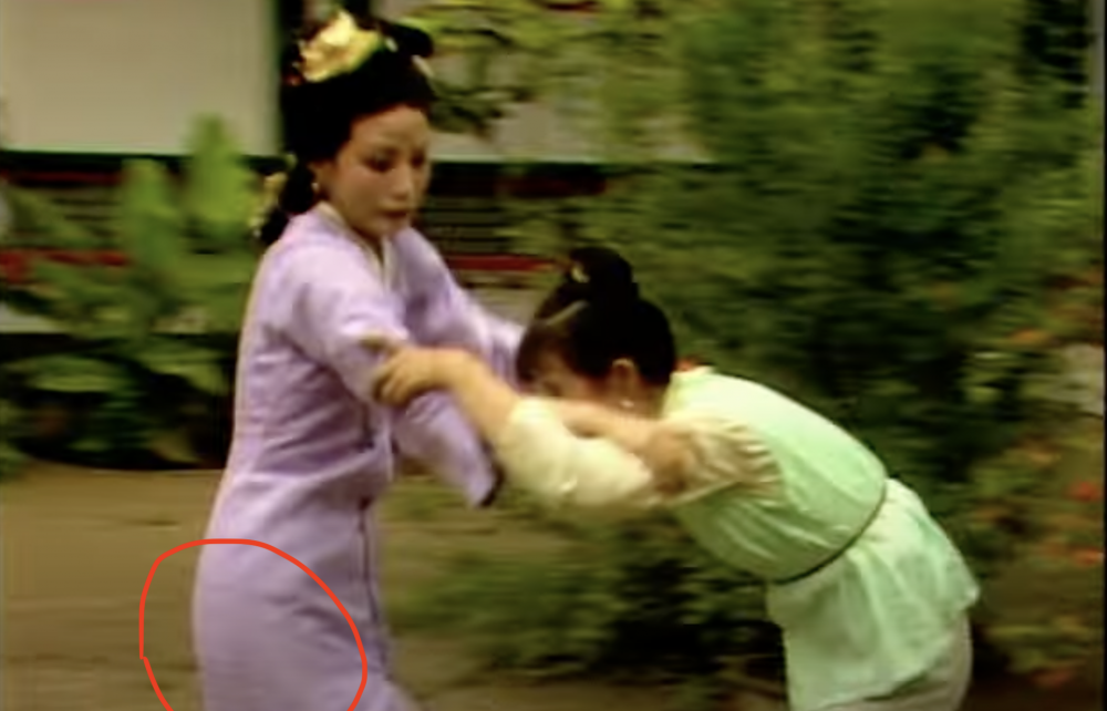 这是之后的镜头:赵姨娘和一群小戏子打群架,可以看到起初赵姨娘屁股右边还是干干净净的。
