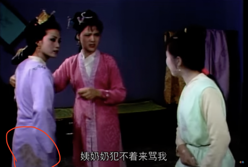 又出了一处严重穿帮。赵姨娘因蔷薇硝一事来打芳官。一来到,就见屁股右边一大团泥渍。而这一团污泥应该是随后跟小戏子打群架被推倒在地弄上的。