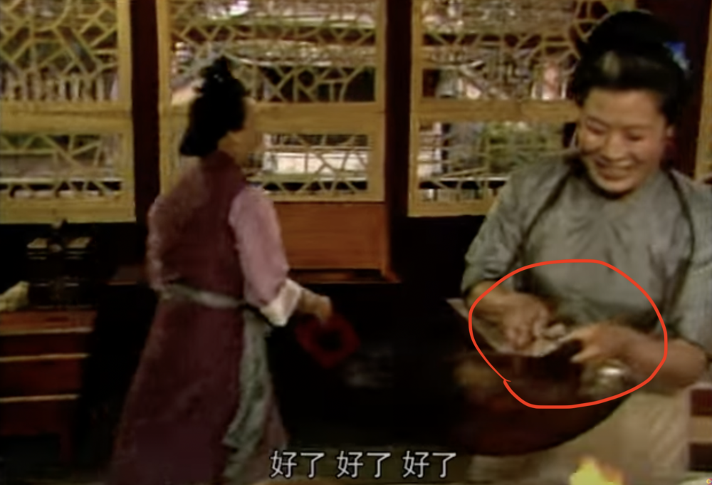 电视剧中这厨娘则一派现代中式炒菜风格,大火爆炒,还会颠锅。