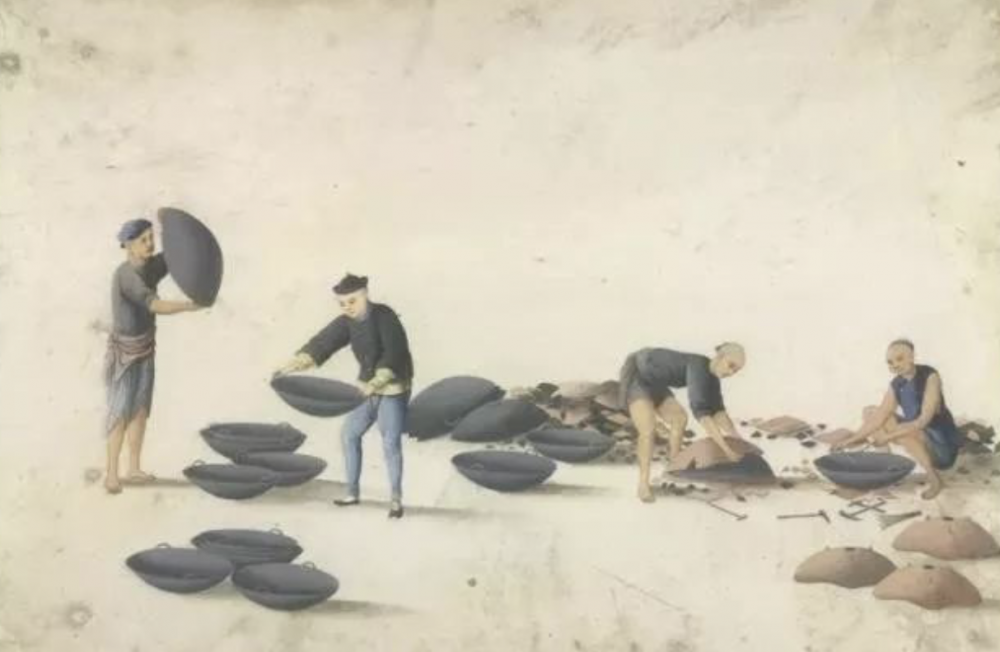 上面是清朝的绘画,显示铁锅都有两个把手。
