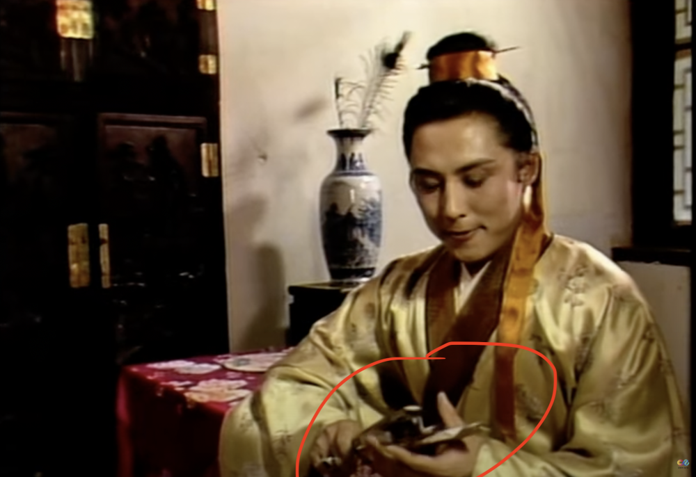 贾琏进屋以后,冰雪天居然掏出了折扇。估计导演为了展示他公子哥儿的风度,不管天气如何,不管外面如何寒风刺骨,且家门敞开,又没暖气,却依然让他舞弄起了随身携带的折扇。
