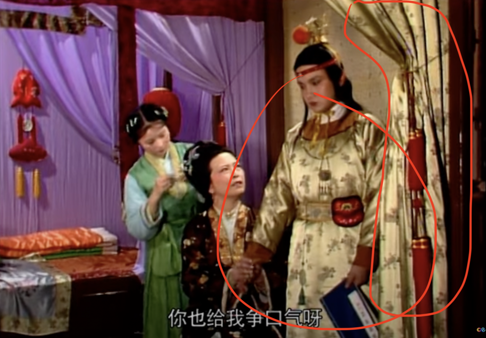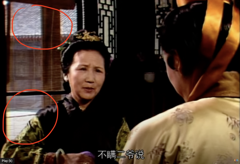 贾母身后的家具,一看就是未抛光就刷漆了,而且上面还落了厚厚一层灰。这豪门家就这么寒碜啊!
