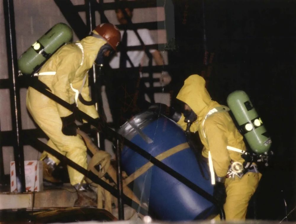 上图为警方身着防化服从达莫公寓中收集证物。