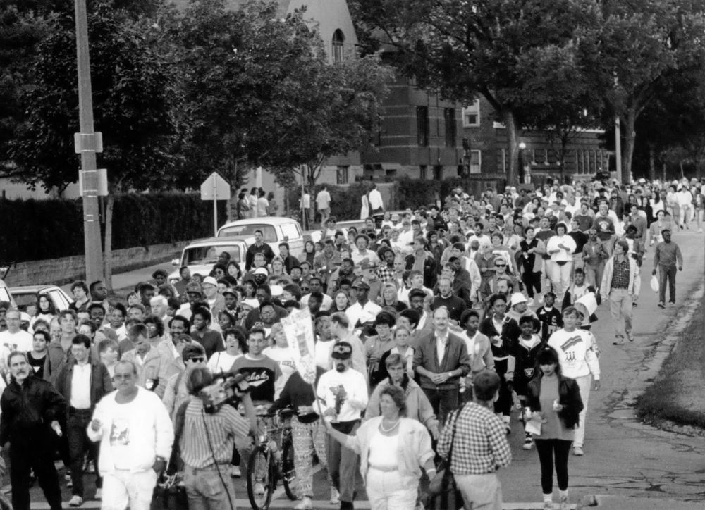 上图为当地民众游行,纪念、缅怀受害者,并对警方不作为表示愤慨。