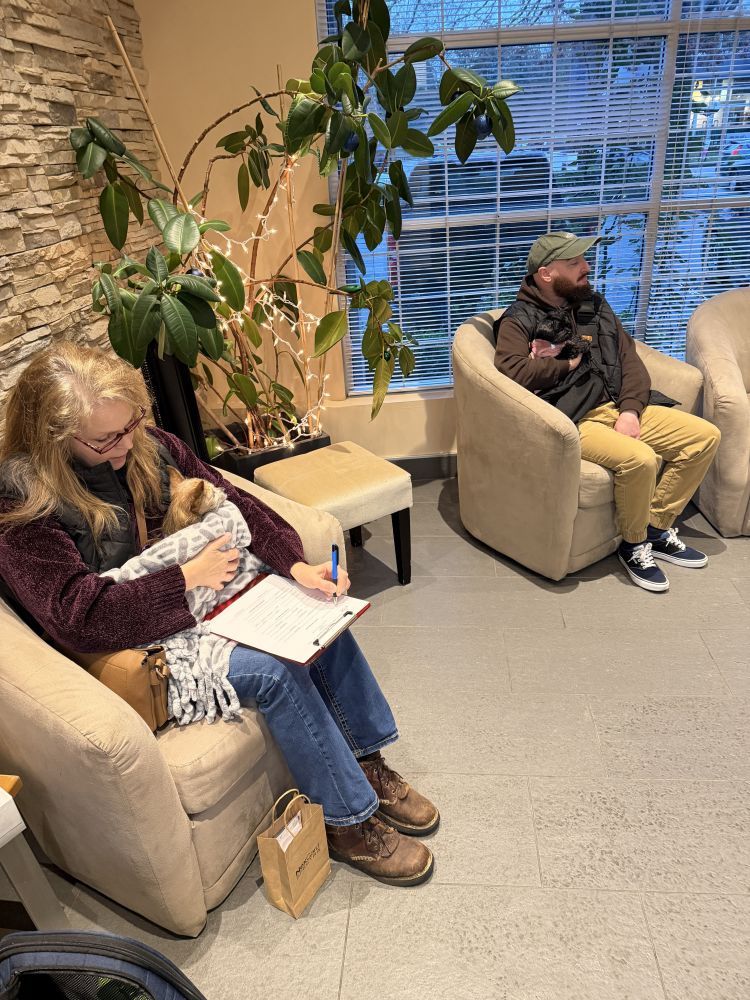 大温哥华地区因此一家专门从事动物齿科治疗的专科兽医诊所,没有同行竞争,因此地点较偏,房租便宜,又收费高昂。宝宝齿科手术后复查,起初给我约在当天早晨8:30。简直疯了,如果8:30赶到,我5点钟就要爬起来。后来我打电话问问能否晚一些,对方又说最晚可以给我安排9:40。即便如此,我也要6:30起床。首先要上卫生间冲澡、吃早饭。穿衣的时候宝宝就听见了,觉得我要出门,赶紧也过来找我。然后我要抱它下楼大小便。之后再走去天车站。再换27路,每20分钟一趟,要等个十几分钟。结果一不留神又多坐了两站,于是又回头走,又放宝宝走走、闻闻、小便。9:00到兽医诊所,此时天还没完全亮,人家员工已经上班了,而且已经有顾客在等候了。