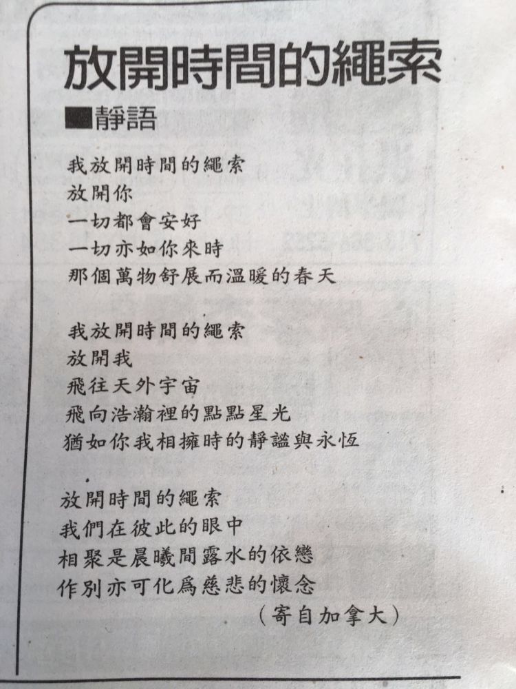 报纸链接 https://www.worldjournal.com/6370018/article-放開時間的繩索/?ref=藝文_世界副刊&ismobile=true