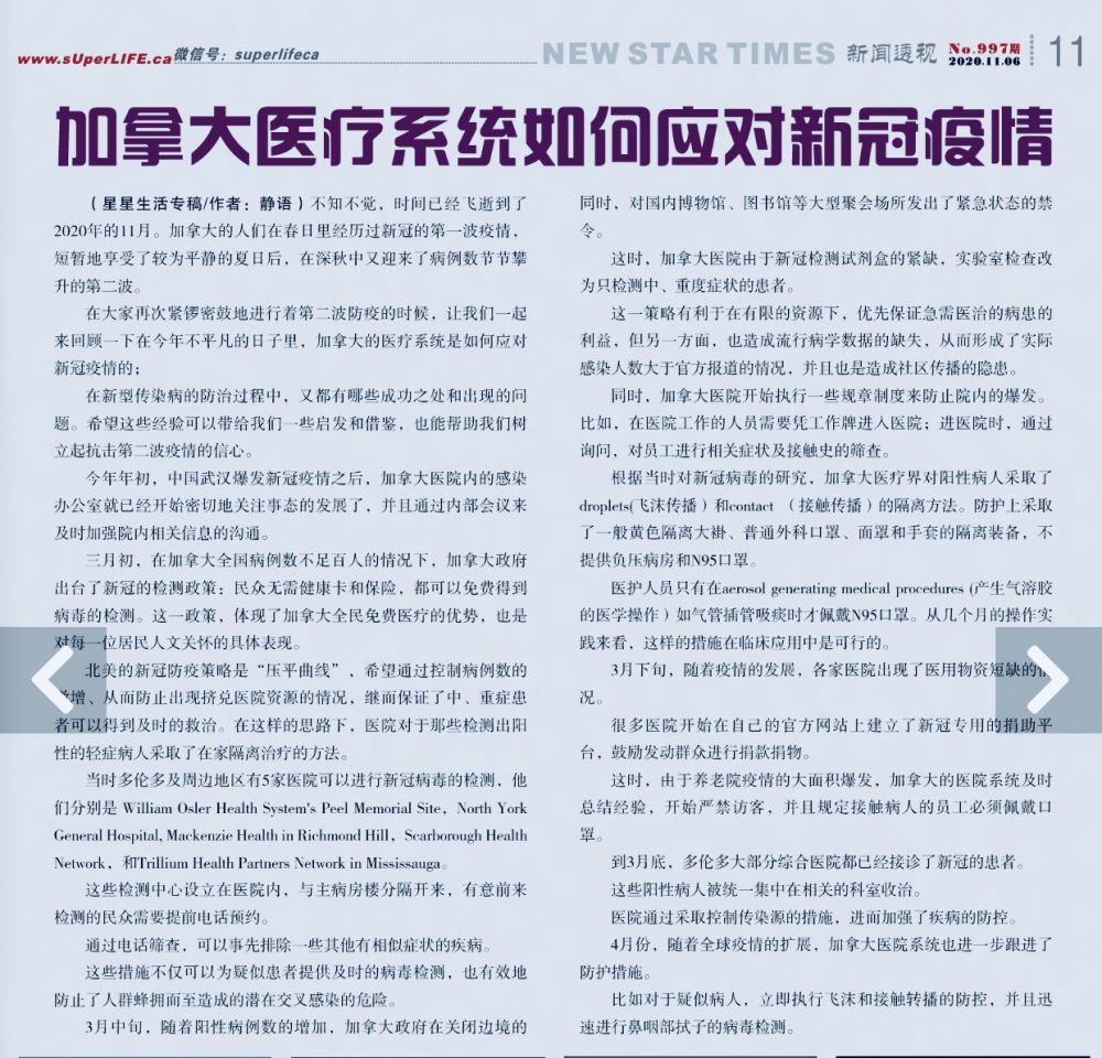 在大家再次紧锣密鼓地进行着第二波防疫的时候,让我们一起来回顾一下在今年不平凡的日子里,加拿大的医疗系统是如何应对新冠疫情的;在新型传染病的防治过程中,又都有哪些成功之处和出现的问题。希望这些经验可以带给我们一些启发和借鉴,也能帮助我们树立起抗击第二波疫情的信心。