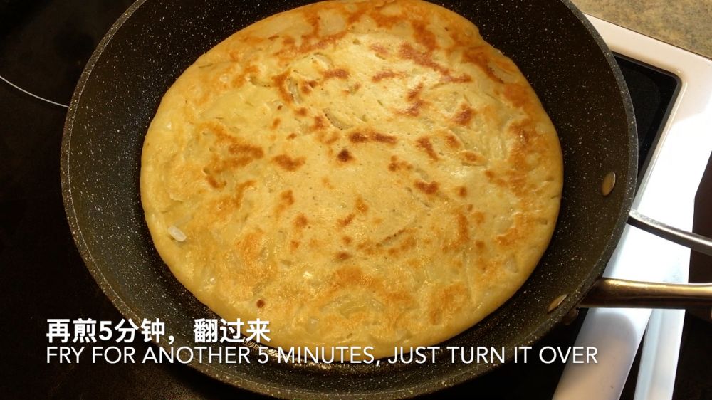 制作也方便:面粉加水、加盐、加蛋调成面糊,洋葱切碎,跟面糊一起搅拌均匀,平底锅里放油,把面糊放进去,撒上芝麻,两面煎黄就成啦!