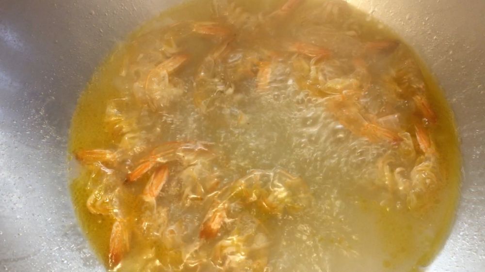 4)炒锅里放适量油,开中小火,先把虾皮挤干,放进去煸香,再加大半杯开水,盖上锅盖,煮虾汤;