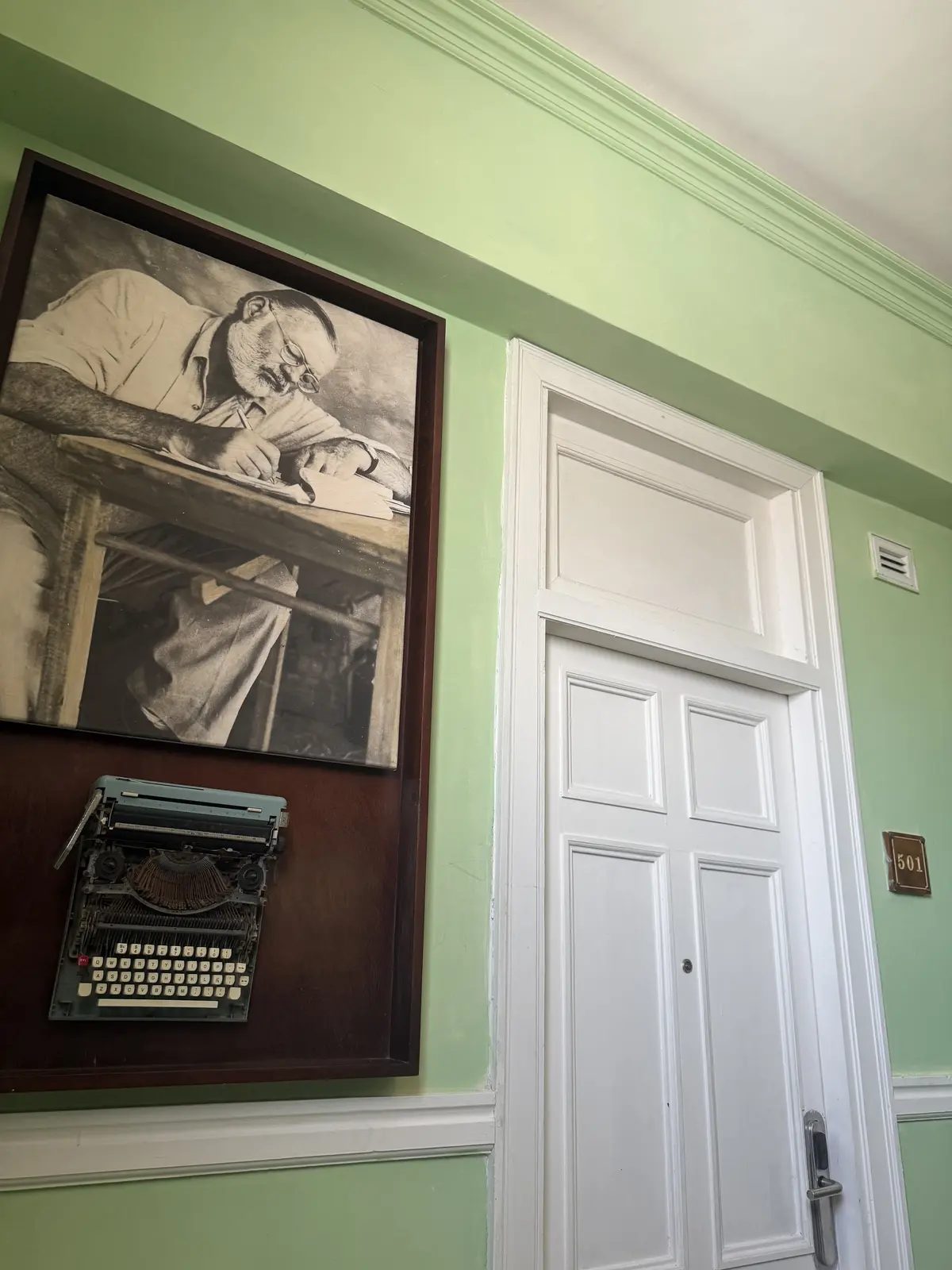 我们参观了海明威曾居住的粉红色小屋,房间不大,但窗外就是哈瓦那的街景。随后去了他常光顾的酒吧“La Bodeguita del Medio”。这个酒吧就在他居住的屋顶上,坐在那里,可以欣赏城市的上空及远景,海明威作家还是有眼光的,找到这样一个酒吧做邻居,是不是有很多灵感。后来我查过海明威还有一所故居,不明白这个房间是什么时候的居所了,大概是最开始不为人所知的时候吧,听说那时的他还把书稿给邻居换取一些生活用品。