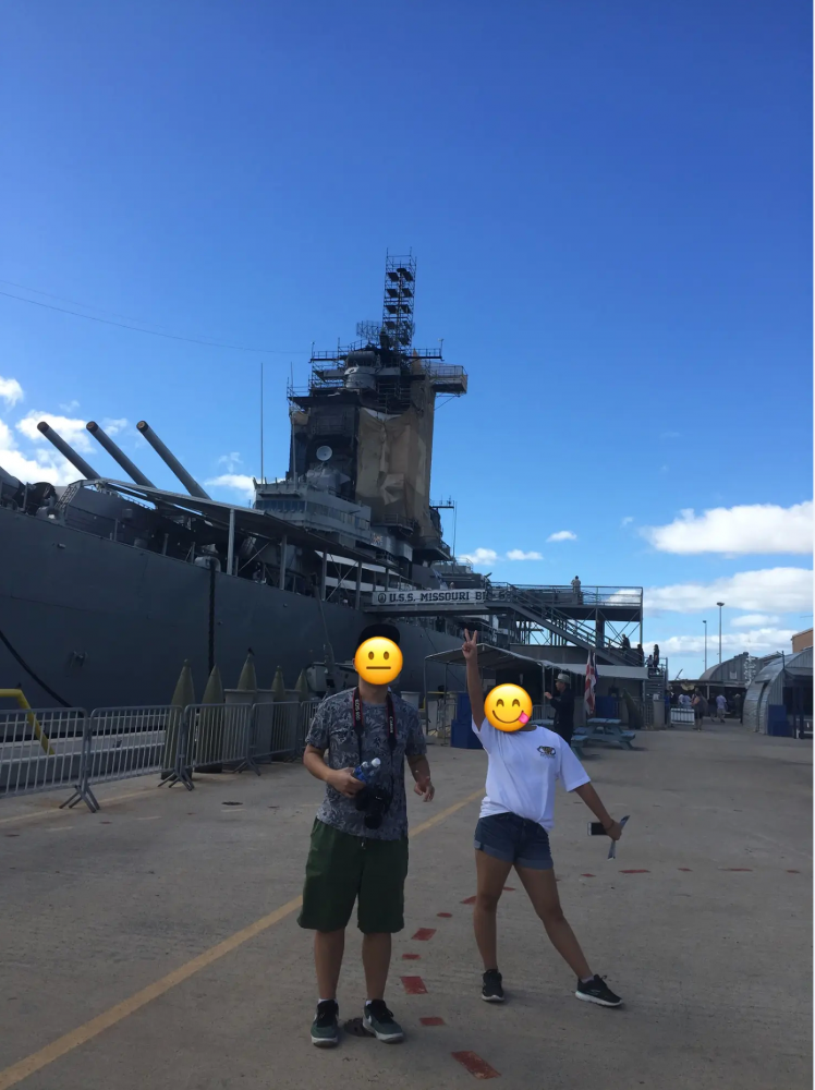 24日这天,按计划要去珍珠港。都说要早去,可俩年轻人磨磨蹭蹭,急坏了妈妈,三人最后九点才到达目的地。这时候车位已经很难找了。终于等到一个车位,把所有东西放在车里,手里只带一个钱包或手机进入园内。妈妈在售票处拿到下午2:45的免费参观美国海军亚利桑那号战舰纪念馆的票。在等待的过程中,我们购买了通票:游览密苏里号战舰,太平洋航空博物馆及鲍芬号潜水艇博物馆与公园。因为是圣诞节期间,很多地方不开放,因而我们有时间仔细地参观了这里。