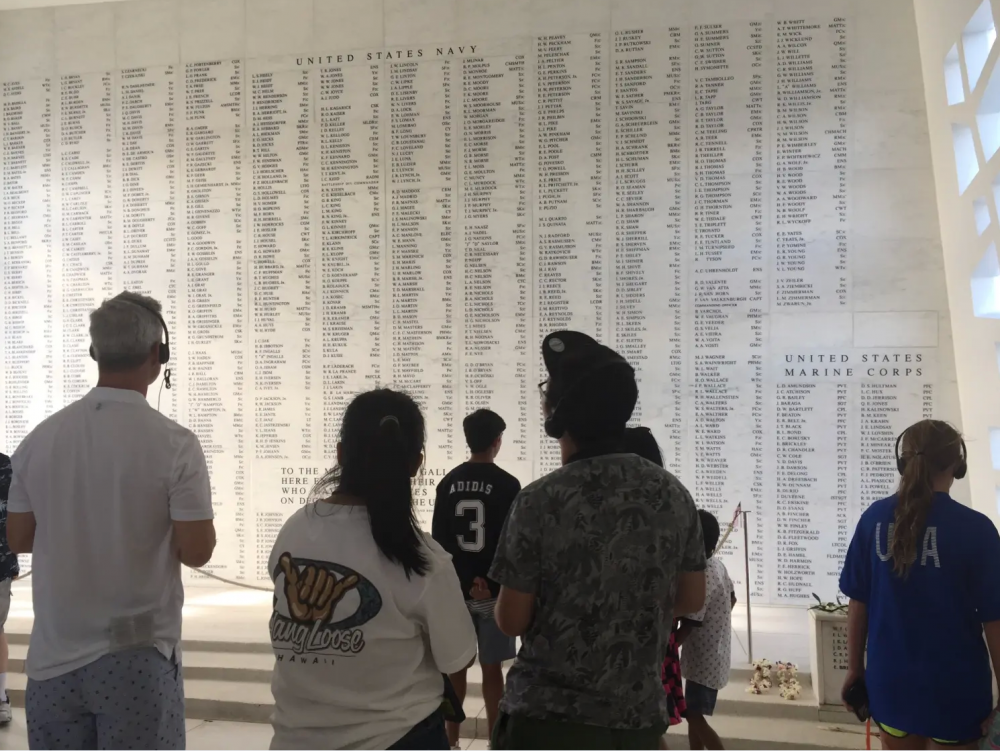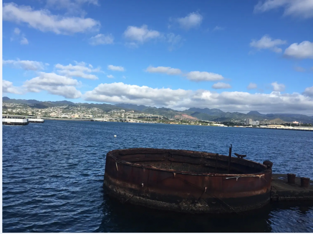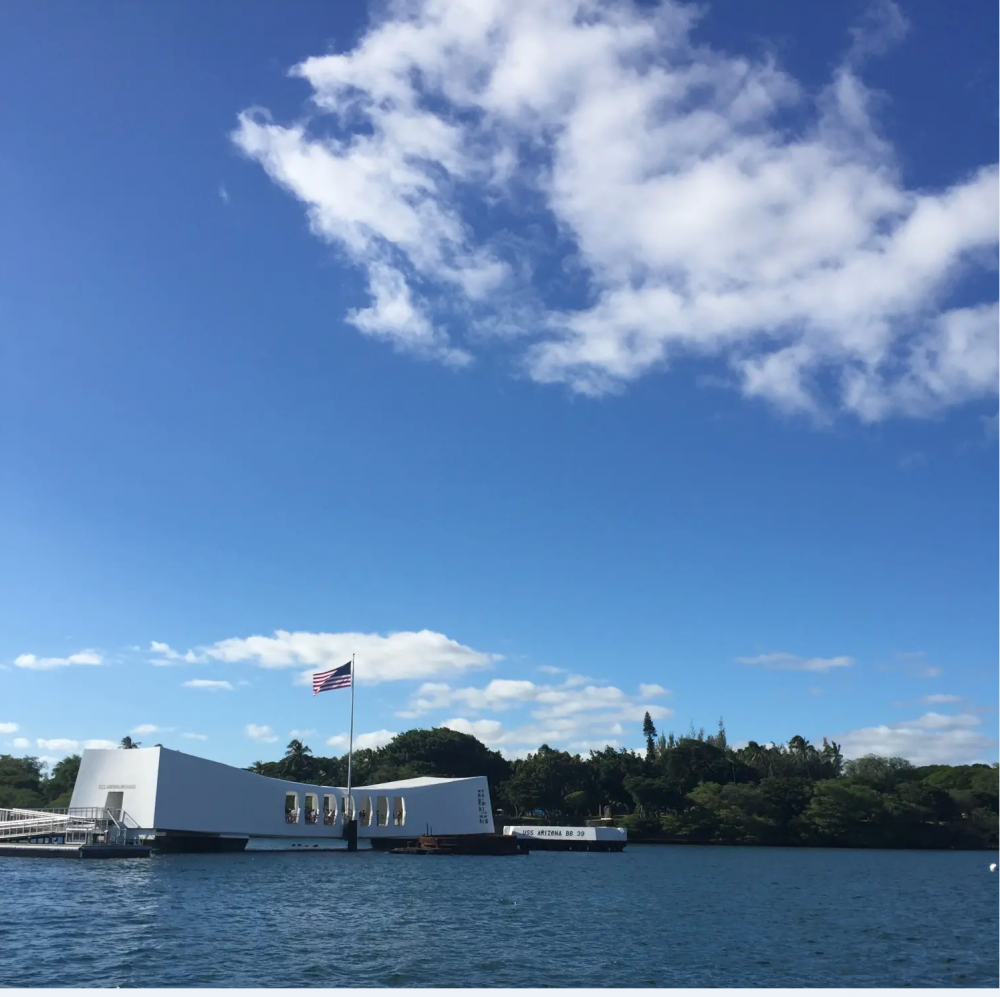 最后一站是:亚利桑那号战舰,当年这座战舰沉没的地方,现在公园的左前方。著名的夏威夷设计师在这里设计成通透自然的博物馆,那艘沉没的战舰在水底依稀可见,锈迹斑斑。这里每天接待着数以万计的游客,向每个游客重复讲述着1941年12月7日早晨曾经发生在这里的故事。