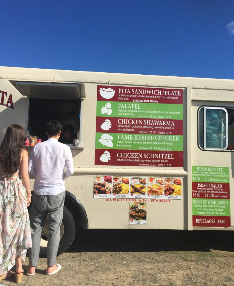 我们三人在车边的简易桌上吃得津津有味。在我们吃饭时,来了不少人,他们先看看我们的盒饭,然后开始排队买饭。看来我们坐在这里吃饭给餐车做了免费广告了。大家都来吃以色列的沙拉饭啊,确实好吃!哈哈。