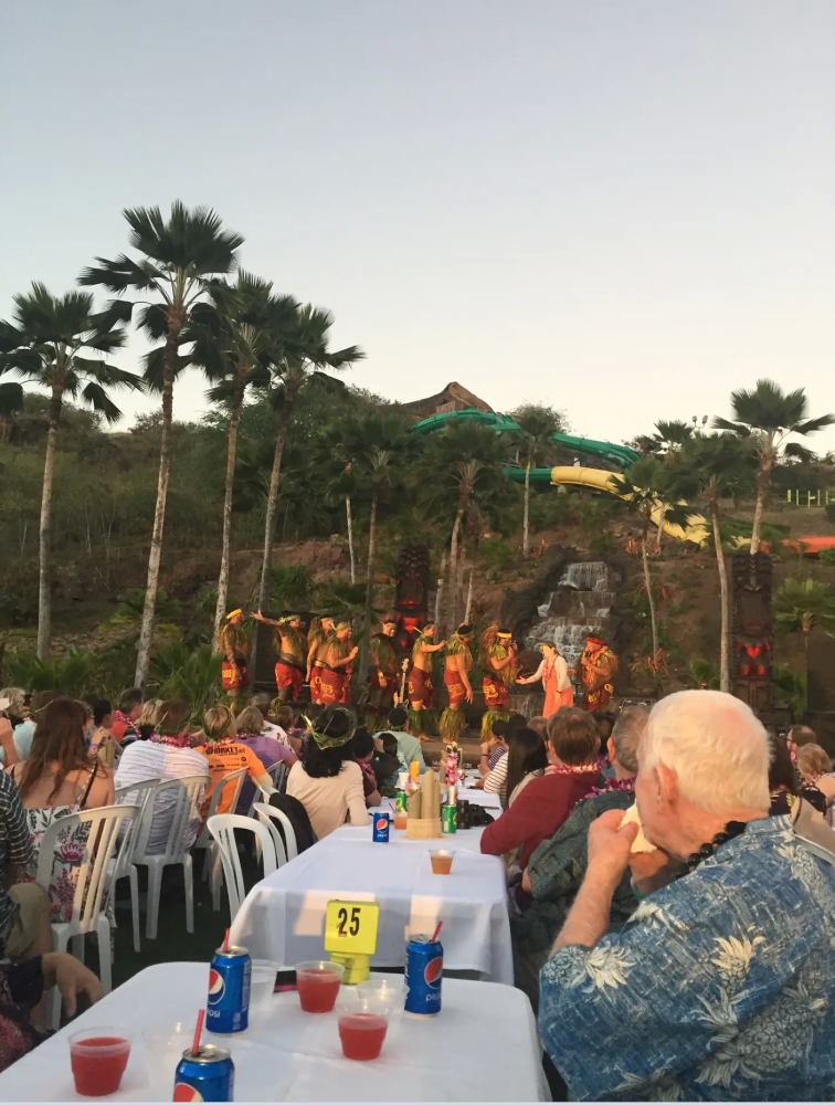 下山后,我们赶往那天最后一个站点:参加当地最传统的宴席——烤猪宴。地址在 Chef’s Luau。正式开始时间是5:30,我们提前了一个小时二十分钟,前来排队的人越来越多,细心的妈妈必须确认自己没有来错地方,这么多人的自助餐,那得多少头烤猪啊!