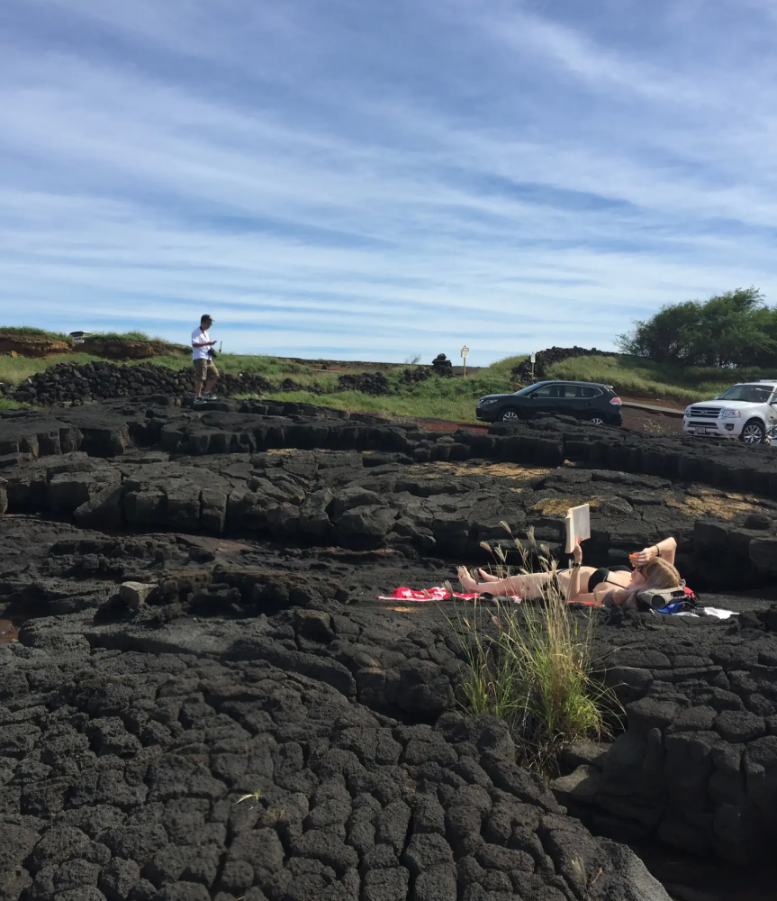 第一站,南角公园,我们从唯一的公路转入小路,前后几乎没有车辆,一度以为我们走错了路。到达地点之后,看到眼前海浪翻腾,游人很少,旅游景点竟有个美女着泳装悠闲地躺在火山石的地面上读书,挺有趣,还有人在悬崖上跳水游泳。