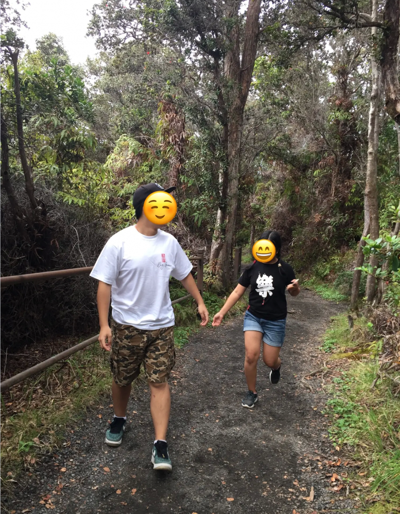 第三站,最重要的大岛活火山公园。路上飘过阵雨,我们到了公园时,雨竟然停了。我们运气真不错,远远看到火山燃烧的气体,孩子兴奋不已,穿过林中小径、探究火山岩浆流过形成的管状山洞、看火山渣锥......眼看渐近黄昏,不能再多逗留。