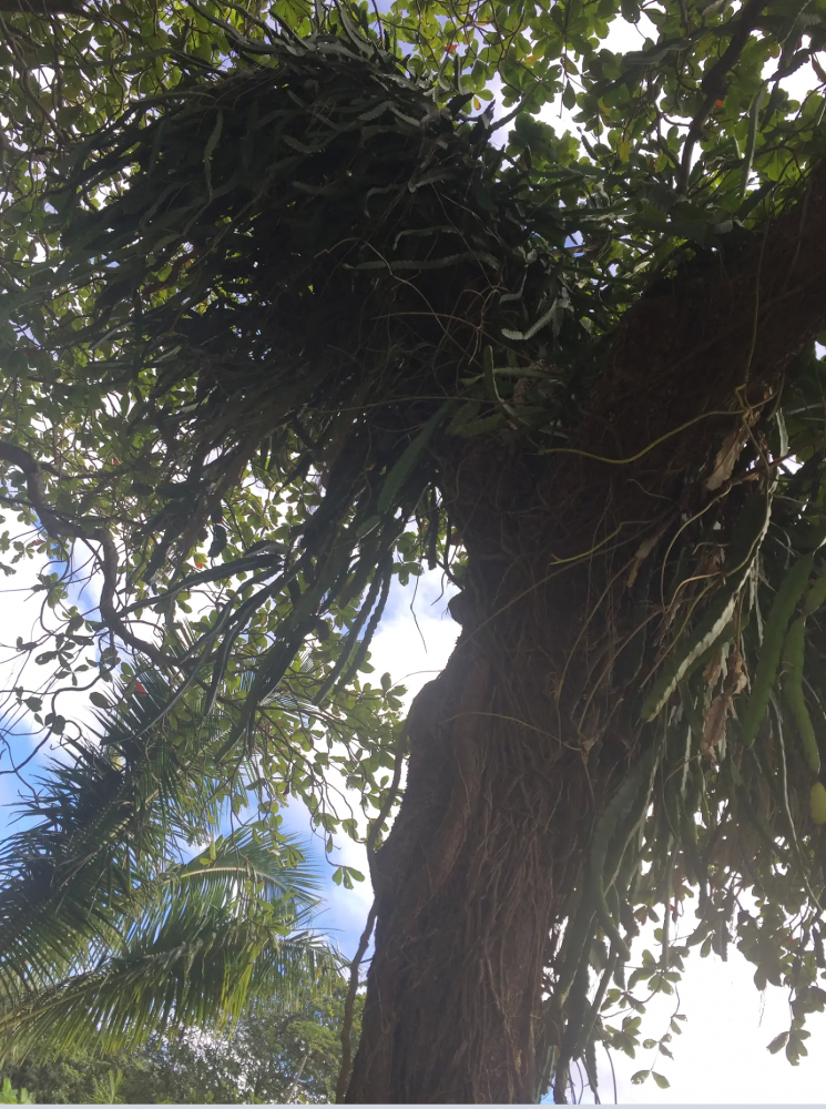 图片这棵叫不上名字的大树也很特别,从它旁边的地上长着的像仙人掌似的植物攀附在它身上,爬过枝架,垂下长长的茎干,像大豆夹,又不像,交叉的地方好象完全长在了一起,分不清你我了。兄妹俩在大树下驻足观看很久。