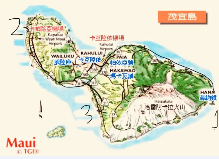 地图上显示我们的一天行程,1是哈纳公路,2是捕鲸小镇.3kikei condo 居住地方.