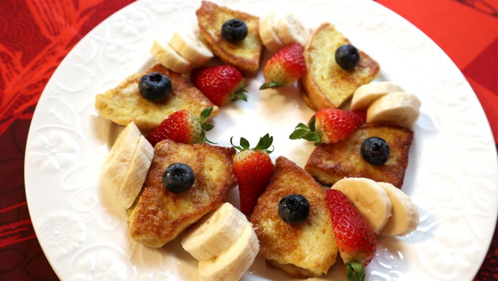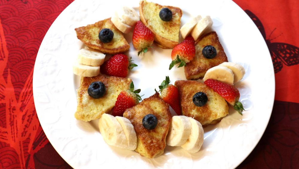 将土司片放鸡蛋液中裹匀。