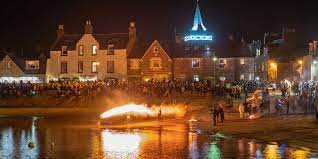 这个地区保留着许多传统的苏格兰建筑和独特的文化元素。比如,火球节(Fireball Hogmanay Festival),据信该节日可以追溯到数百年前,始于苏格兰乡村的传统庆祝方式。后来,在石港得到了独特的演绎。石港的火球节是苏格兰各地众多的新年除夕庆祝活动中最引人注目的活动之一。它是一场扣人心弦的盛大的庆典,如同冬夜的烈火般燃烧,点亮这个宁静小镇的夜空。每逢新年之际,安静的石港小镇一下子会簇拥着成千上万的游客,石港的街头巷尾都沸腾起来,活动的核心是参与者手持着巨大的火球,犹如闪烁的星辰一般,挥舞着跳动的火光。这些火球,仿佛是岁月的象征,蕴含着人们对过去时光的感慨和敬畏。