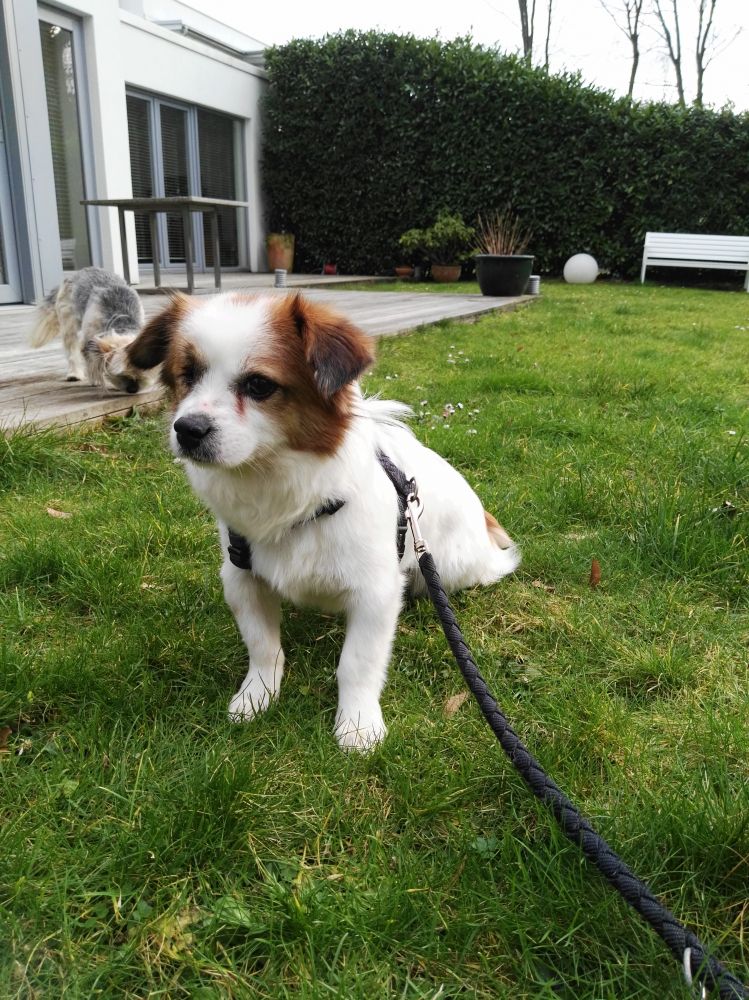 亮亮非常胆小,黄花鱼一样,走路溜边儿。在屋里就自己缩在一角,不说不动。每四个小时我出去遛他一次,头两天他就笔直跑不左右张望,更不画地盘留记号。憋不住了才尿一次拉一次。 晚上抱他上床,他也缩在床脚,不是和毛毛,丫丫,德仔,八戒他们抢位置。 在院子里也是站那里看别人玩,自己不动。 我轻视了亮亮。第二天,抽不冷子,亮亮拖着牵引绳就跑了!因为我还属于在家隔离,穿着拖鞋运动裤,蓬头垢面的,哪里顾得上想,跟着就追出去了。好在马上就是狂欢节了,有些人家度假去了,马路上静悄悄的没什么人和车。亮亮钻到一部法拉利下面去,感谢主!感谢观音菩萨,感谢阿拉!能感谢的都谢了一圈,不是吉普车。 亮亮那么瘦小是扁着肚子挤进去的,我急于拉他出来,太着急了一使劲牵引绳又不够紧,就脱落了。 亮亮就爬在里面不动。我爬下来,想拉他出来,他就往里躲。我绕到另外一边够他,他又往反方向挪,总之不让我够着他,我又不敢走开,怕他出来跑了。来回来去地够他,就是够不着。马路上也没人,我去按法拉利那家人也没反应。急得我要上房了。过来一个遛狗的,是住在后面一条街的,赶紧拦住他让他堵住一边,我堵一边,才把亮亮拉出来。回家第一件事就是换一个更保险的胸带给亮亮,再不敢大意了。