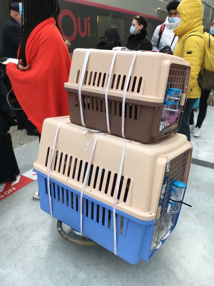 Bella 和Zara 是土狗串,救助后一直在一起,大概不到两岁的状况。土狗在国内找领养非常困难,可能性基本是零。 1月9日,四个娃就动身了。 他们动身后,我也基本没时间睡觉。 比较了几个方案后,决定验核酸,开车去布鲁塞尔。然后搭火车去巴黎的戴高乐机场。他们早上6:00 到达,最早到机场的是从布鲁塞尔过去的头班火车,7点多到。那时候巴黎宵禁,我一外国车牌不敢直接开车去巴黎。疫情的规定,又不适合在酒店过夜,只有开车去布鲁塞尔然后转火车,才能符合三个国家的防疫政策,我才能进出自由而且回家后不用报告和隔离。 9日凌晨1:00 我就起来了。保温杯灌上热水,还扔几个枸杞子进去,灵不灵不管,心理作用大。2:00 出发往布鲁塞尔开。一路大雾,到布鲁塞尔火车站正好5:00, 可以从容地停车转了一圈熟悉下地形。头班火车是5:30的。天都没亮,还下着雪,火车站里冷冷清清,想上个厕所都不开门。火车很正点到了巴黎机场,一位在巴黎的救助人士已经提前到替我接到四个娃,然后帮我推到进站口,我去买了四张狗的车票。法国火车要求狗要买票,12欧元一张。和中国一样,火车快进站了人才能进去,上车才发现,火车很窄,两个大航空箱根本只能勉强放过道那里,加上小乖乖待的手提袋一摞上就顶到车顶了。 好在2个多小时就到,过道也有那种折叠的椅子。