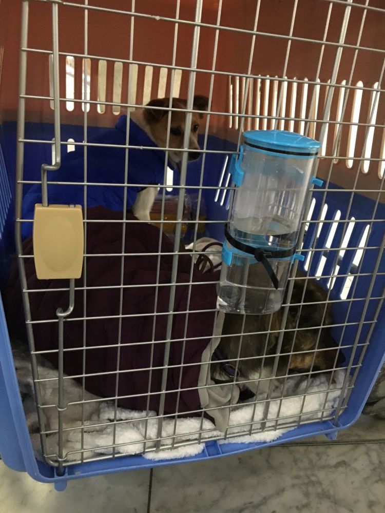 Bella和Zara在一个航空箱,是个五号航空箱,一般是装大金毛大秋田的,两狗一起还是挺重的,咋也举不到后备箱里。停车场不要说人,连车都没几部。 最后没办法只好把Bella 和Zara牵出来。看Bella 老实,就让她上车。给Zara穿上两个胸带,两条绳子紧紧地绕在我手里,拉着Zara,另外一只手用力把空的航空箱甩到车上。心想,两位大姐,你们没拉在航空箱里吧? 要不一甩全甩出来了。航空箱上了车,再把Bella 和Zara 推进航空箱里关好门,再把Luis连箱带他抱进后备箱放好,小乖乖就放在我旁边位置上,小乖乖直挠包,我给他水,他全喝了。孩子渴坏了。