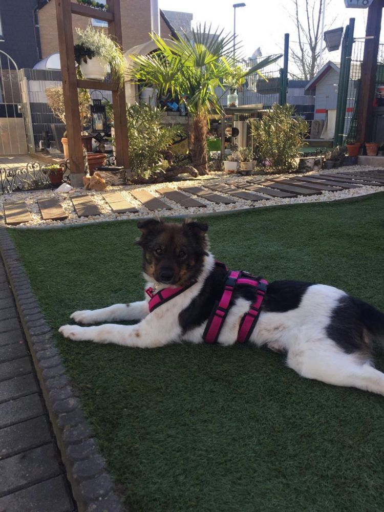在我家住了三个星期后去了新家。在新家Bella轻松活泼充满活力。我去看她时,她在院子门口等着我,看见我掉头就往屋里跑,叼出她的新娃娃给我看。