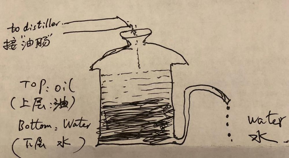 把薄荷茎和叶子均匀地装进大铁锅,加足量的水,然后用煤炭在灶膛里慢火加热。这加热是技术活,火太旺蒸汽出来太快,油会在空气中挥发掉,火太小又不产蒸汽,油出不来。蒸汽从锅顶部通过管子引到油肠,油肠置于冷却水容器里,让蒸汽形成液体流入油缸。烧薄荷的人如果偷懒,不勤换冷却水,那蒸汽没有变成液体,油也没了,所以不管白天晚上,每个班上都由勤劳负责的人负责烧火,并督促其他人换水, 还要查油缸里的油层是否太厚了。油缸的工作原理是我父亲解释给我听的,至今记忆犹新,并作图3 以利解释清楚。油水混合物流入油缸,油缸底部旁伸出一个往上高出油缸一半的弯管,油比重小在油缸上层,水比重大在下层,随着油水增多,上面的油压下面的水从弯管流出,而油永远在上面留在缸里。如果出油量多,烧一锅薄荷油缸盛不下,中间要“撇油”,就是把上层的油转移到出售成品油的油桶里。