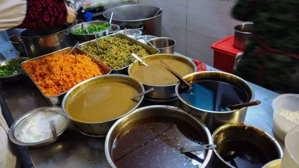铺子里一个人烫面,一个人添酱,十几个锅碗瓢盘敲得噼里啪啦的,20秒以内,务必给你做好一碗咻咻冒烟的热干面~