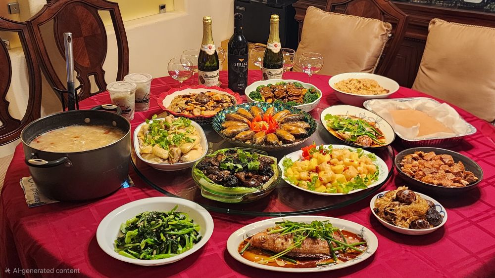 银耳桃胶木瓜淮山瘦肉汤香煎牛仔骨香葱蒜蓉长寿菜滑蛋虾球红烧鳗鱼饭[