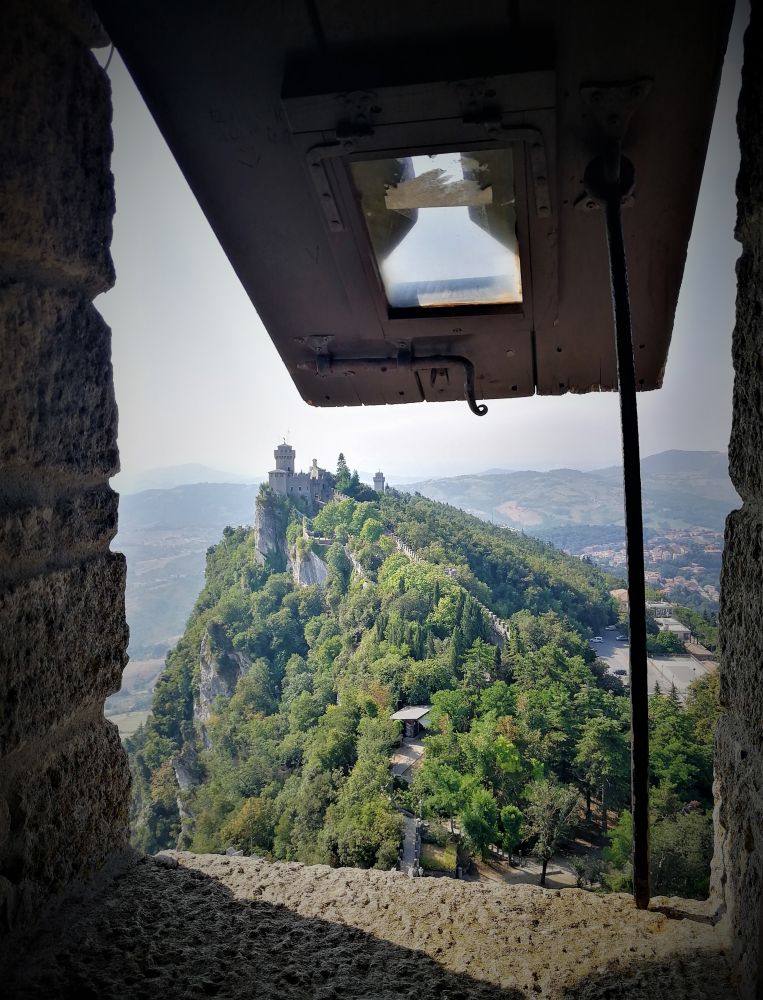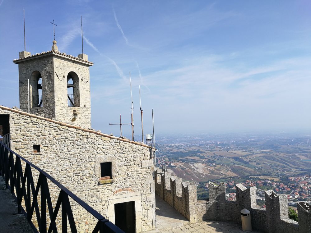 Guaita堡垒是Monte Titano建造的三座塔中最古老的,也是最著名的。 它是一个带有锯齿状围墙并包含了一座了望塔的小要塞, 建于11世纪,曾用于监狱。它是国旗和徽章上描绘的三座塔楼之一, 于2008年被注册为世界遗产。
