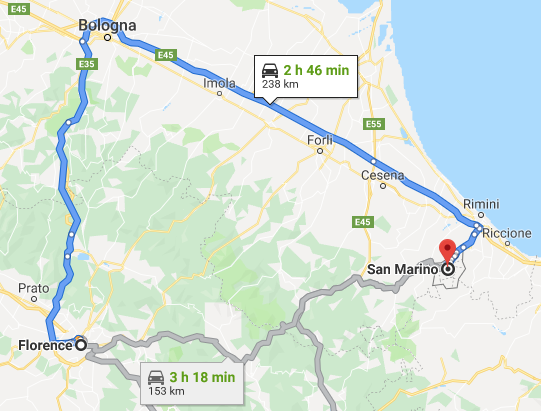 离开佛罗伦萨 (Florence) 开车向东230km, 就到了圣马力诺(San Marino)。
