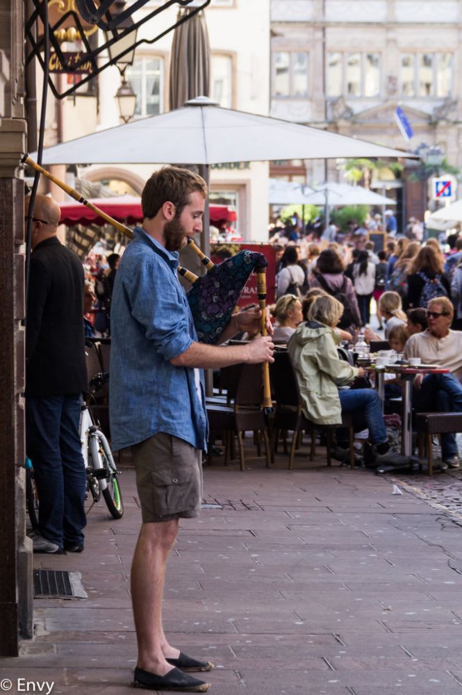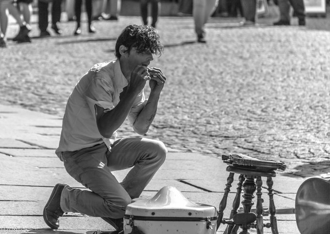 从他演奏的过程中的面目表情来看,是丰富而沉醉其中的,不确定从专业的角度,他水平如何,至少听着还是让人舒服的。一直保持着聆听的状态,为他照了许多特写。后来在一家咖啡店坐下,要了啤酒,咖啡和甜点。他继续着演奏,逐渐就能听出他大约有四首曲目循环。每结束一轮后,他会停下来,到琴盒中拿出烟丝和烟纸,卷个炮,抽上两口。他大约进行了一个半小时的表演,然后起身,收拾起所有家当,及民众投的硬币,撤离广场。