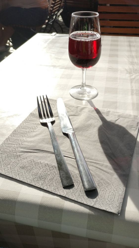 晚餐,在河畔最佳取景点附近的一家餐馆。大约法国行中最奢侈的,也是感觉最好的一餐,口感超好的牛排配烤小土豆,鹅肝配面包,阿尔萨斯红酒。我知道感觉最好,并不完全是因为食物,而是周遭的一切。夕阳西沉中,逆着阳光拍着各色斑斓的影像。听着各式语言与河水流淌声。见来往进出的服务人员,倒酒、上菜、结账、碰脸、道别、打扫。餐馆隔壁的墙上,有夕阳从树隙中投上的阴影,与路灯、窗户、花篮交融出温润与明丽,丝毫没有清晨那般的清寒。我端起红酒对着满眼的秋光中举杯,那掬醇红揉和着夕阳所呈现出烂漫的娇柔,盈盈的微醺。不由想起刚学的法语,说了一声,santé。