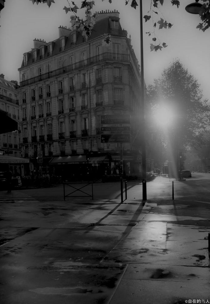 从地铁口出来的一刻,清秋的晨光,正好透过梧桐树的枝桠间,投映到我脸上,为清凉中增添了一些微温。巴黎环卫工人结束了他们的工作,正不紧不慢地收拾着。地面有多处未干的水迹,深一洼浅一洼地,与枝桠间透下的晨光交相辉映着。街上来往的车辆与行人,尚且稀少。间或有树叶跌落的声响清晰可辨。迎着晨光望去,是一路延伸下去的红灯,绿灯还在等待它的时机。