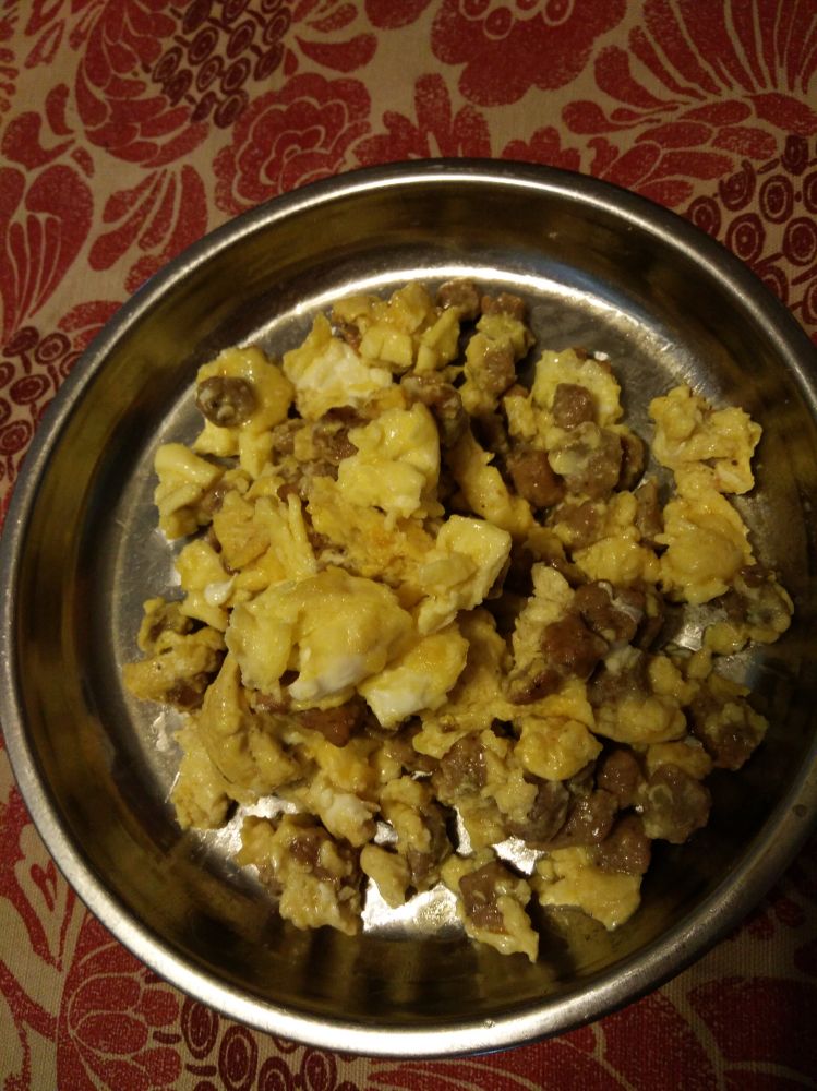 突然冒出写一篇关于女婿炒鸡蛋博客的念头,问女儿有没有拍那个大盘炒鸡蛋,她懊恼地讲:“哎呀。只顾吃,忘记拍了。”幸亏老伴还没有动盘子。我赶紧拍了一张老伴还没有动的早餐。我们很少用一次性塑料盘子,觉得浪费又不环保,喜欢用不锈钢盘子。照片中盘子里的炒鸡蛋就是老伴今晨的洋早餐——鸡蛋炒肉粒。这一盘子炒鸡蛋是老伴一个人的早餐哦,当然还要按我们的饮食习惯配一点点馒头。虽然女儿他们认定了这就是早餐,但我们总觉得它是菜!你们看到了觉得是饭还是菜呢?