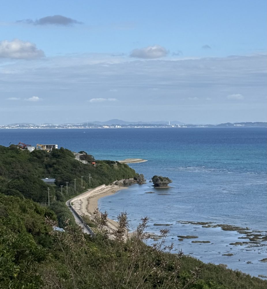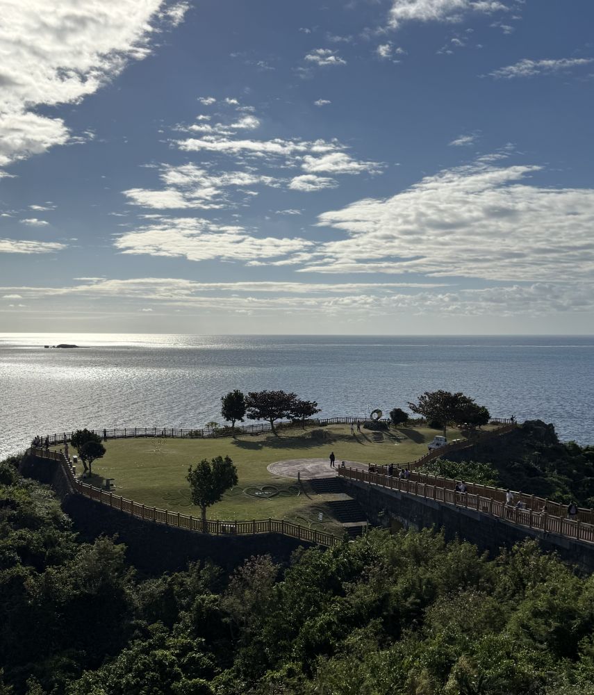集合地点放在县厅附近。由于共知的缘由团员清一色的台湾人。导游小牟听口音是大陆出生。满满一车浩浩荡荡地向我们今天主要景点所在地南城市开去。南城市介于那霸市与糸满市之间,那片地方以丘陵石灰岩地形居多。甘蔗田、海岸线和原始林地散落其间。农地以小规模家庭种植为主,本地居民生活气息浓郁。开了40来分钟我们到了第一站:知念岬。知念岬公园是个观景点不收门票。它面朝太平洋视野非常开阔,天好时可远望久高岛。这里的海水由浅到深很有层次感。牟导介绍说,这是因缓慢下沉式的礁盘地形所致。近岸水浅、沙底反射阳光多呈浅蓝;稍远水深又遇珊瑚礁便呈蓝绿;再远深海区光线吸收多即呈深蓝。任海风吹过脸颊撩起发丝。在知念村住上几天是个不错的选择。这样就可以看尽日升日落漫步知念岬了。