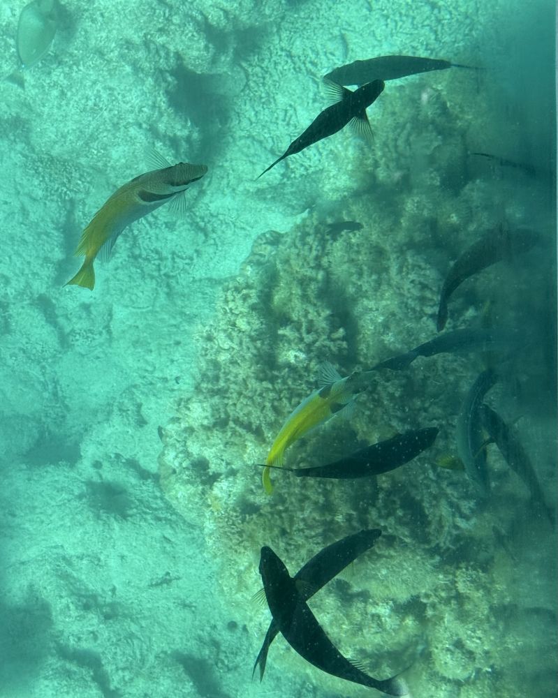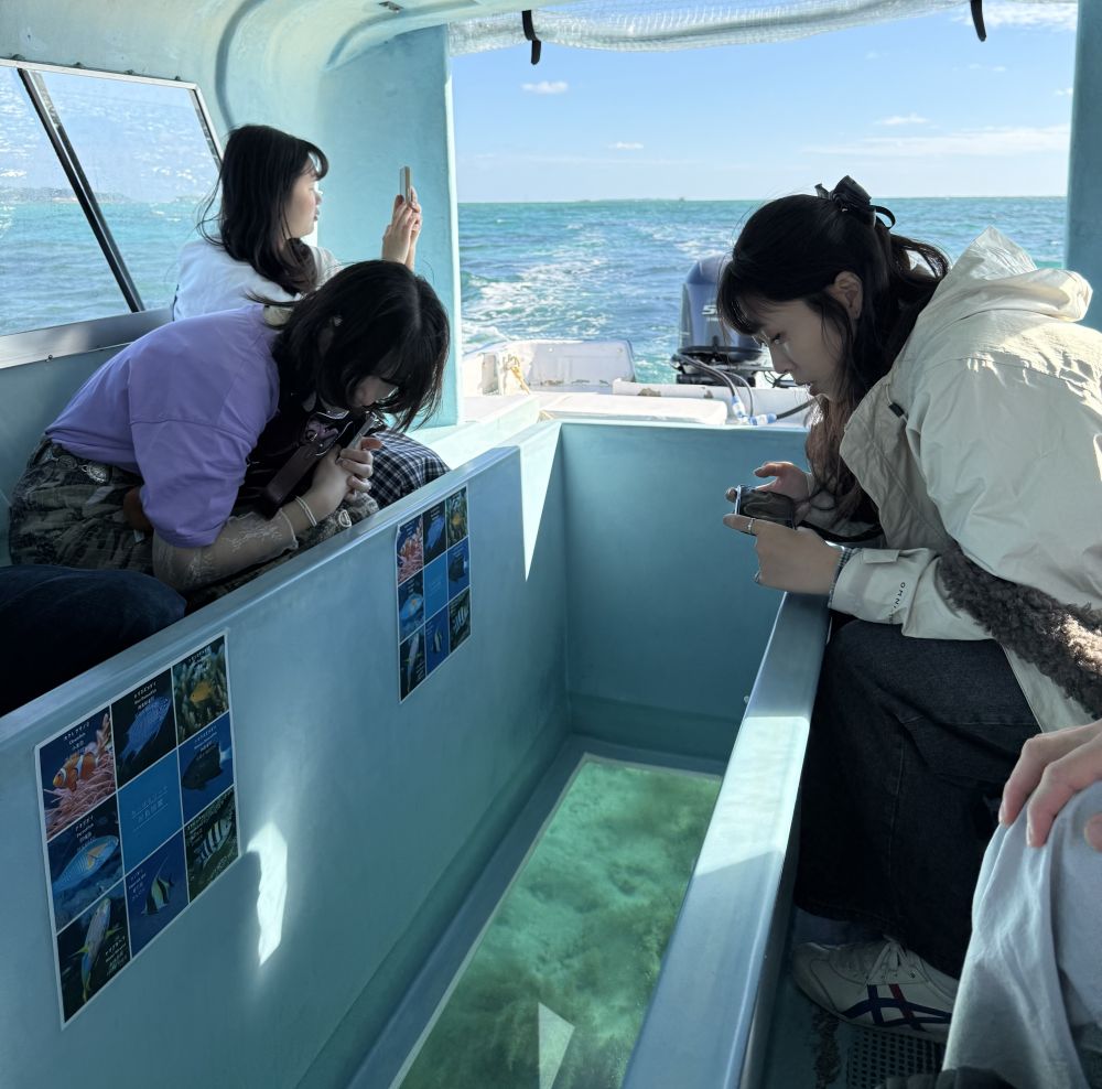 在牟导的催促下团友们依依不舍地离开知念岬。下一个景点新原海滩距离不远开车只需15分钟。新原海滩不如本岛北部那些网红沙滩出名优点是安静休闲。我们到时正赶上退潮时分礁石都露出水面,远看像一个个棋子。我们来新原海滩的重要目的是乘坐玻璃船观赏热带鱼。这里是珊瑚礁地带且海水清澈透明。玻璃船每船只能载10人,开到远处的珊瑚礁地带看鱼。我晕车晕机更晕船,导游让我备好呕吐用的塑料袋。鱼儿们色彩斑斓惹人爱。深蓝拇指小鱼游过来,船老大指着船舷贴图说那是蓝绿雀鲷;黄色透明稍大的鱼叫黄尾雀鲷;而身体偏平黑白条纹的叫军曹鱼。船至深海摇晃加剧几乎临近侧翻,好在观赏接近尾声,船老大一脚油门将我们快速送至岸边。有惊无险,没晕!
